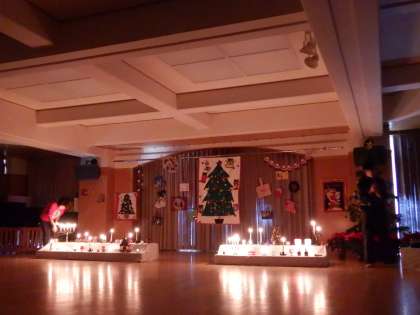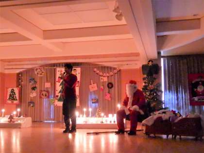 今日は楽しい集いでした。遊戯室に入ると、いつもと違う雰囲気にワクワクしていた子どもたち。学年ごとにクリスマスにちなんだ歌を披露したり、ろうそくに火がともされる様子を見たりしました。