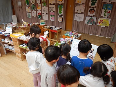 今日から二日間、遊戯室で園内展を開いています。早速保育の中で自分たちの作品を見に行ったクラスもあり、自分の作品を見つけて喜んだり、他学年の絵やごっこ遊びの作品など見て、「〇〇ちゃんのや!」「ニワトリさん(の絵)面白いね」「このゾウ鼻長い!」「このお店屋さん行った!」など楽しそうに話していました。遊びの中でうまれた子どもたちの作品ががたくさん飾られ、その一つ一つに思いが込められています。お家の方でじっくりと、そしてお子さんと一緒にお話しながらゆっくりと見ていただけたら嬉しいです。明日の18時まで開いていますので、是非お越しください。