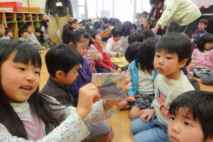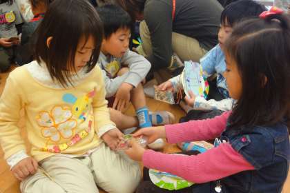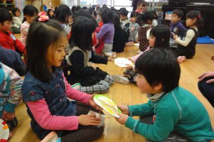 年長さんのお兄さんお姉さんと遊ぶのが今日で最後の日になりました。一緒に遊んでもらったり、手をつないで遠足に連れて行ってもらったりといろいろお世話になったので、心をこめたプレゼントを渡しました。年少組は紙皿で作ったレターフォルダー、年中組は小学校に行って使ってもらえるように年長組さんとの思い出を絵にかいたしおりを自分の思い思いの言葉を言って渡しました。年長さんからも、年中組さんや年少組さんが喜んでくれそうな絵をコースターにしてプレゼントしてもらいました。きっと大切な宝になることでしょう。