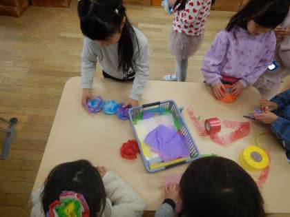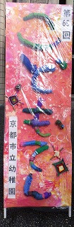 京都市総合教育センターで開催されているこども展に見学に行きました。自分の作品を見つけたり、他園の友達の作品を見たりして「すごいな」「おもしろそう」と楽しく見学していました。幼稚園に帰ってから、「こども展に飾ってあったお花(花笠)がつくりたい」とお花紙で花をつくって遊ぶ姿がありました。いろんな作品を見て刺激を受けたようです。