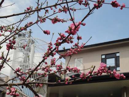 あたたかな春の日ざしが園庭に注ぎ、桃の花が咲き始めました。