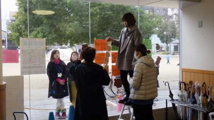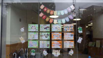 幼稚園の北側のガラス面に「中京もえぎ幼稚園ってどんなところ?」という内容の飾りが掲示されています。保護者の皆さんの企画・制作・掲示で、保護者目線の中京もえぎ幼稚園がよくわかる内容になっています。とてもかわいい掲示ですので、ぜひお近くに来られた際はご覧くださいね。