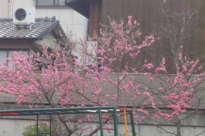 園庭の桃が満開です。