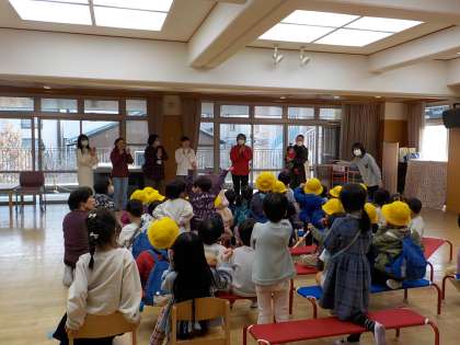 今年度最後の絵本ボランティアさんの日,お世話になった絵本ボランティアの方々に年長児が代表してお礼のお花を渡しました。いつも子どもたちが楽しめるように工夫をして絵本を見せていただき,ありがとうございました。