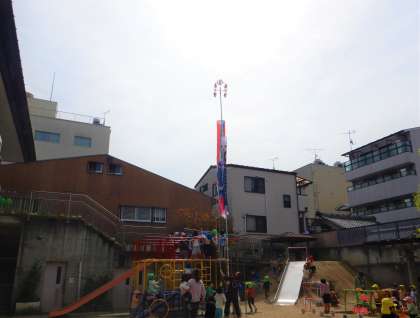 今日は5歳児の子ども達が園庭に大きな鯉のぼりをあげてくれました。「よいしょ!」と声を合わせて紐を引っ張ると,3匹の鯉と吹き流しがぐんぐん空を上りました。3歳児、4歳児の子ども達も「あがった〜!」と喜んでいました。しばらくして風が吹き、「あ!泳いだ!」と嬉しそうな子ども達。「明日もあげてあげようね」と、楽しみにしています。