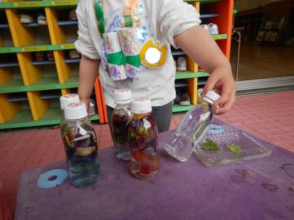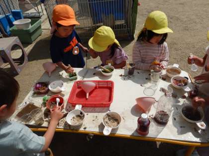 始業式の日にはきれいに咲いていた春の花も、だんだんと咲く時期が終わり、「先生、チューリップのお花が落ちちゃった…」とAちゃん。落ちたり枯れたりした花を使って、今度は色水遊びを楽しんでいます。色々な道具を使って花や草をすり潰したり水を混ぜたりし、「赤になった!」「なかなか色が出てこない」「昨日はピンクだったのに茶色になっちゃった」「ずーっとやってたらこんな色になった!」「これは抹茶のジュースだよ」など、色々なことに気が付いたり、試したり、イメージしたりしながら遊んでいます。
