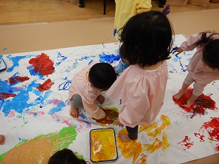 大きな紙や段ボールなどに手や足を使って色をぬって全身で楽しみました。