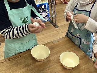 できた豆ごはんを自分で握っておにぎりにしたり、3歳児や5歳児、職員室にもおすそ分けをしに行ったりしました。