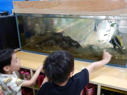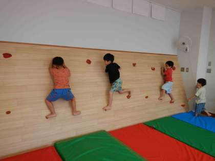 今日はすみれ組がおいけあした保育園に遊びに行きました。登園時間は雨が降っていましたが、出発するころには雨も止んでくれました。おいけあした保育園に着くと、さっそく園内を案内してもらい、いろいろな遊びができることを知った子どもたち。「ここで遊びたい!」としたい遊びを見つけて、様々な先生、友達とかかわりながら遊ぶ姿がありました。つくったりかいたりして遊ぶことができる“つくるーむ”では、様々な素材を組み合わせたり絵の具を使ったりして好きなものをつくることを楽しみました。そして、保育室ではカードゲームや塗り絵をして遊びました。“できるーむ”では、ボルダリング・リレー・なんでもバスケットや椅子取りゲームなどの遊びを楽しみました。また、保育園で飼育されているカメやサカナにも興味津々の子どもたちでした。子どもたちにとって、刺激的でとっても楽しい1日になったようで、また行きたいね、また遊びに来てほしいね、という声が自然と聞こえてきました。