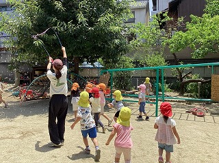 チェーンから出てくるたくさんのシャボン玉に子どもたちは大興奮で、追いかけたり触ったりしている姿がありました。