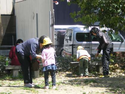 子どもたちは軍手をはめて,保護者の方と一緒に,公園を探しまわり,「こんなんあった!」「これは燃えるごみ?」などと,お菓子の袋や吸い殻,空き缶などを拾っていました。いつも使っている公園ですが,この取り組みを機に,落ちているごみを見逃さない目,気持ちよく生活しようという心が育ってくれればいいな,と思います。