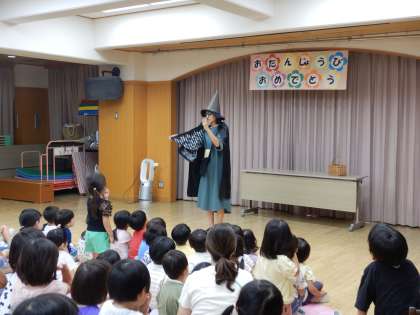 9月生まれの誕生会に魔法使いの魔女さんが遊びに来てくれました。魔法を使うと不思議な事がたくさん起こり、驚きの連続でした!最後に、忘れたはずの手紙のプレゼントも無事届けてくれましたよ!またいつか遊びに来てくれるといいですね。