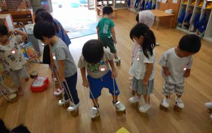 4歳児と一緒に遊戯室で運動会ごっこをして保育室に戻ると、プレゼントが届いていました。「開けてみよう!」とみんなで袋を開けると、中には竹ぽっくりが入っていました。「私のマークだ!」「竹馬かな?」「こうするんちゃう?」と思い思いに遊び出す姿がありました。また、「サンタさんかな?」「幼稚園の先生じゃない?」と誰からのプレゼントなのか予想したり、「みんなでお出かけに行こう」と竹ぽっくりに乗って遊びに出かけたりすることも楽しみました。