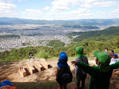 登り口までが少し遠くて、「疲れた」という声もはじめはありましたが、いざ山のふもとに来ると、木陰がとても涼しくて気持ち良く、「頑張るぞ」と気持ちを切り替えて登り始める姿がありました。4歳児は初めての山道で、体をどう使って登るか考えながら一生懸命上る姿があり、5歳児は友達と話しながらどんどん登り進めたり、疲れた4歳児を励ましながら登ったりする姿がありました。みんな登りきることができ、山頂からの景色がとてもきれいで、達成感を味わうことができました。御所やお家の方からの鏡を使った光の交信も大成功で、「光った!見えた!」と大喜びでした。ご協力ありがとうございました。