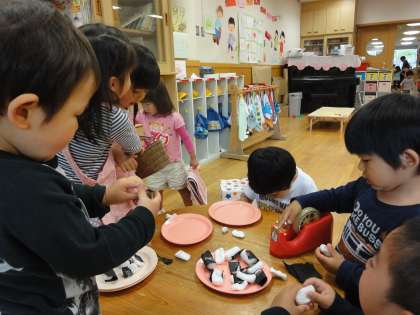 「おにぎりいかがですかー?」おにぎりごはんにのりを巻いて,おにぎりのできあがり!お買い物に行ってごはんやのりを買ったり,お皿におにぎりを並べたりして楽しかったです。