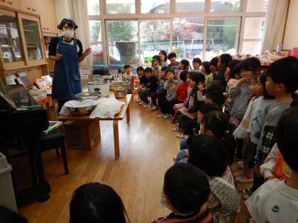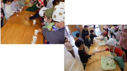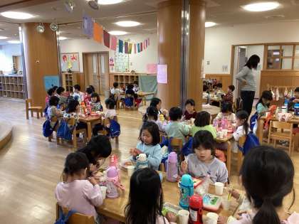 芋掘り遠足に行き、たくさんのサツマイモを収穫した4歳児の子ども達。5歳児のことも達に招いてもらったポップコーンパーティーに憧れて、「おいもパーティーしたい!」計画してきました。みんなで決めたメニューはおいもご飯と焼き芋です。今日は待ちに待ったおいもパーティーの日。調理の様子を見たり、おにぎりを握ったり、お店屋さんみたいにお客さんとのやり取りを楽しんだり…。お店が大成功した後は4歳児みんなでおいもパーティーをしました。「みんなで食べて楽しかったよ」「何回もおかわりした!」「お客さん、『おいしい』って言ってくれたよ」と、おなかも心もいっぱいになった子ども達でした。