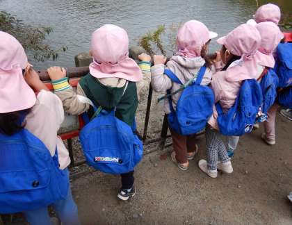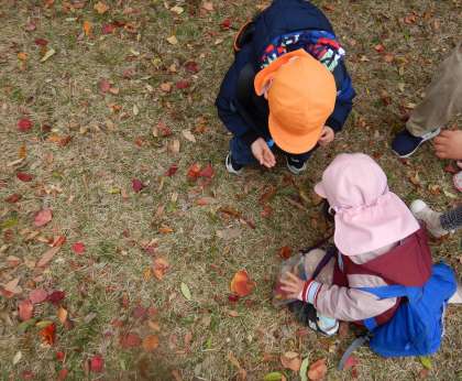 3・4歳児は、ドングリや色づいた葉っぱをたくさん拾って、「こんなにドングリあった!」「きれいな葉っぱ!」と先生や友達と見せ合うことを楽しんでいました。大きな池ではコイや鳥を見つけると、驚きつつも嬉しそうな様子でした。秋の自然をたっぷりと味わうことができました。