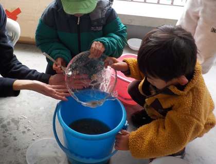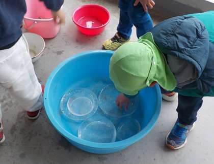 昨日からだんだん寒くなってきて、きっと氷ができる!と、いろいろなところに水をはって準備していた子どもたち。今朝登園して雪の舞う中見に行くと、分厚い氷ができていました。バケツの氷を割らずに丸いまま取り出したいという‟ねがい”をもった子どもが、先生や友達と とがったもので氷の周りを指してみたらどうか、バケツを倒してみたらどうか、等々、いきいきと一生懸命考えて、やったー!丸い氷が取り出せました。丸い氷を1枚、2枚と数えて集めていました。楽しかったね。