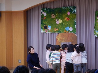 今日は生活発表会2日目(ちゅうりっぷ組・ひまわり組・ゆり組)でした。昨日から「明日は自分たちの番だね!」と張り切っていました。緊張していた子どもたちもいましたが、動物やうらしまたろう、たつのこたろうになって遊んだり、劇遊びをしたりしていると、楽しそうな笑顔や大きな声でセリフを言う姿も見られました。終わった後は達成感や充実感を感じているようでした。子どもたちの自信になる経験になっていたら嬉しいです。