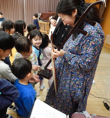 普段あまり目や耳にしない楽器に興味関心をもって、その音色に耳を傾けていました。「おもちゃのチャチャチャ」や「さんぽ」「山の音楽家」など知っている歌を聴いてみんなで声を合わせて一緒に歌ったり、草原を駆ける競走馬を描いた「賽馬」という曲に思わず体を揺らしたりしていました。25周年ということで、みんなで「ハッピーバースデー」の歌も歌ってお祝いしました。