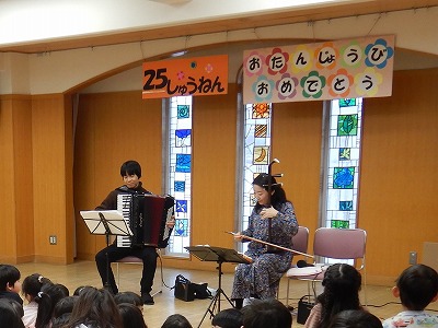 今年度は、中京もえぎ幼稚園の創立25周年ということで、去年も来ていただいた二胡とアコーディオン奏者の方をお招きして、記念音楽会を開きました。