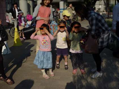 5月21日に竹間公園で金環日食の観察しました!7時20分頃から日食眼鏡をかけて,スタンバイしていました。「うわっ,三日月みたいや!」「だんだん丸くなってきてる!」と,子どもも大人も興奮しながら見ていました。日食の影を見るために,お家から段ボールで作った,手作り道具を持ってきてくれる方もいらっしゃいました。7時30分頃になると,辺りが少し暗くなり,太陽が少しずつリング状になってきました。とても不思議で素敵な時間を過ごすことができました。