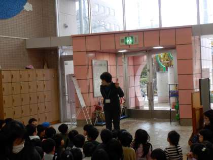 今日は避難訓練をしました。いろいろな場で遊んでいる時に放送が流れたのですが、落ち着いて身を守る行動をとっていました。訓練後、各クラスで東日本大震災の話や災害が起きた時にどのように行動すればよいか考えました。