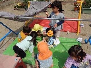 鉄棒下にマットを置いていると、いつの間にかそこに子どもたちが集まっていました。何をしているか覗いてみると、ダンゴムシを手にのせて可愛がっていました。虫かごに土を入れたり、「ごはんだよ」と枯れ葉を入れたり、「これもあった方がいいかも」とドングリなども入れたりして、子どもたちなりに大切にしている姿があります。