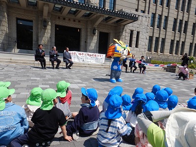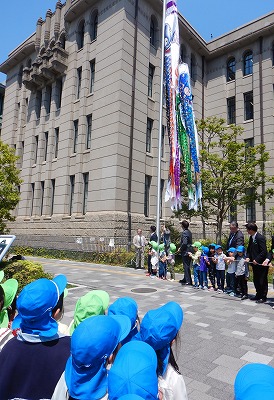 京都市役所前で行われたこいのぼり掲揚セレモニーに招待され、近隣のおいけあした保育園の友達と一緒に参加してきました。主催の京人形商工業協同組合の方や教育長さんのお話を聞き、端午の節句やこどもの日に込められた願いについて知る機会となりました。端午の節句イメージキャラクターの「よろいこうたろう」くんも登場し、手品を見せてもらったり、豆こいのぼりをプレゼントしていただいたりしました。園で楽しんでいる「ぼくのおひさまパワー」の体操を元気いっぱい踊ったり、おいけあした保育園の友達の素敵な歌を聴かせてもらったり、楽しい時間を過ごしました。そして最後に、みんなでこいのぼりの歌を歌いながら、大きな大きなキラキラ輝く立派なこいのぼりが揚がるのを見ました。「金色に光ってる!」「幼稚園のより大きい!」「5匹もいる」と嬉しそうに見たり、「よろいこうたろう」くんと握手をしたりしていました。毎日子どもたちが、元気に過ごせますように、大きくなりますようにと、市役所前に掲揚されています。是非ご覧ください。
