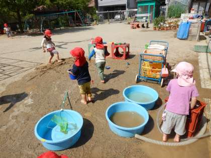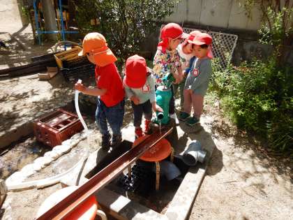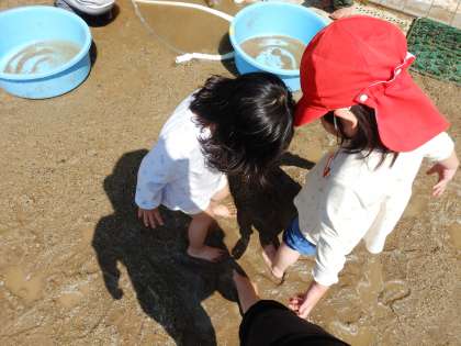 入園して1か月がたち、安心して遊びに向かう姿がたくさん見られるようになってきました。今は、水や泥に触れて遊ぶことを存分に楽しんでいます。たっぷりの水にまみれること、とろんとろんの泥に足を入れてみること、お兄さんたちが楽しそうにしていた井戸の遊びを真似てみることなど、「面白そう!」「楽しそう!」と感じたことにまっすぐ向かっていく姿が見られました。