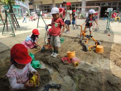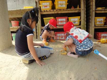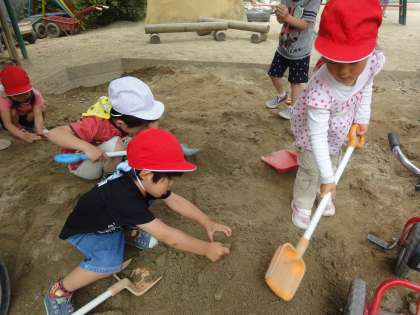 今日はいいお天気!朝から大きな山をつくろうと砂場に向かった年少組の子ども達。