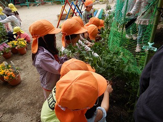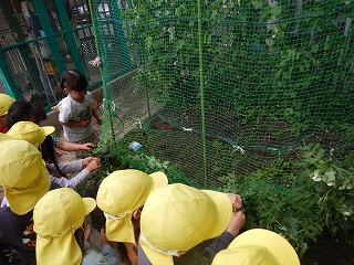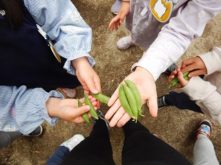 今日はスナップエンドウとソラマメを収穫しました。「大きくなってきたね」と水やりをしながら、食べることを楽しみにしていた子どもたち。ソラマメはさやも自分たちで割りました。「見て!大きいよ」「ちっちゃいのもあった」と出てきた豆を嬉しそうに見せたり、「ふわふわだね」と中がそらまめくんのベッドと同じことも確認したりしました。