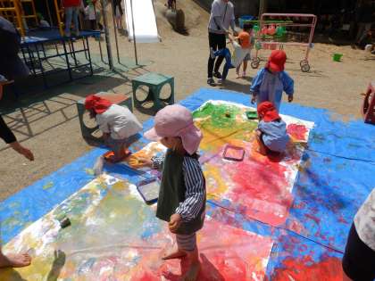 今日はとってもいい天気!園庭で、絵の具遊びを楽しみました。「赤色ちょうだい!」「私は黄色!」と、自分の好きな色を使って、絵の具の感触や色の混ざりを楽しみました。絵の具の上を歩くとつるつる滑って、「スケートみたい!」とスケートごっこを楽しむ姿もありました。絵の具遊びの続きには、絵の具に水を入れ、色水をつくって遊ぶ姿がありました。「やってみよう!」と思ったことを、素直に楽しむ子どもたちでした。