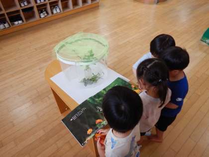 もえぎ幼稚園北側玄関に仲間入りしたあおむしの幼虫がさなぎになりました!日に日に成長している姿を見て子どもたちも驚いているようです。絵本で調べたり、あおむしの歌をうたったり…どのクラスの子どもたちも蝶になる日を楽しみにしているようです。