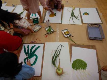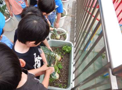 昨年度から育てていたタマネギをみんなで収穫しました。大きいタマネギを収穫して「タマネギの王様や!」と喜んだり、「皮は茶色っぽいけど、中は緑と白や」「ツルツルしてる」「光ってるよ」と気付いたことを友達や先生と話したりしていました。収穫した後、絵の具でタマネギの絵をかくことも楽しみました。