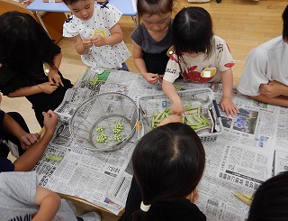 今日はウスイエンドウを収穫しました。豆の中でも大きくなるのが1番遅かったので、「まだかな?」と触って確かめ、中のまめが大きくなることを心待ちにしていました。「ザラザラしてる」とさやの感触が他の豆と違うことにも気付いていました。さやから豆を取り出すことにも慣れ、「きれいに取れた」「爪を使ったらいいんだよ」とコツを掴み、豆むき名人になっていました。豆ごはんにするのが楽しみだね!