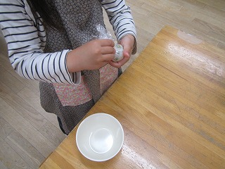 おいしいご飯になるようにみんなでおまじないをかけて、炊飯スタート!しばらく待つと、だんだんといいにおいが漂ってきました。蓋を開けるとモコモコと湯気が出てきました。「うわあ、雲みたい」と子どもたちは大興奮。「ふわふわのおにぎりにしよう」と,子どもたちは優しくおにぎりをにぎっていました。食べてみると、「おいしい」「甘い味がする」と言いながら、友達と嬉しそうに食べていて、大満足な様子でした。