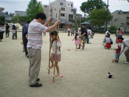 3歳は竹コッポリ,4歳は一本歯下駄,5歳は竹馬をうちの人と一緒に作り