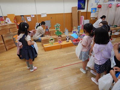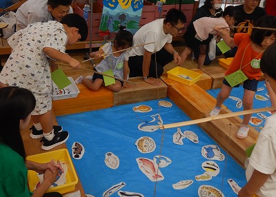 今日は、年に一度の“夏のつどい”がありました。この日のために、お家の方々が用意してくださり、各クラスごとにいろいろな遊びのコーナーを回って楽しみました。3歳児はいつもと違う幼稚園の雰囲気にドキドキワクワクしながら遊んでいました。4、5歳児は、去年までの記憶を思い出しながら、「輪投げやりたい」「次はどこ行く?」「新しいゲームもあったな」などクラスの友達と一緒に回ることを楽しんでいました。