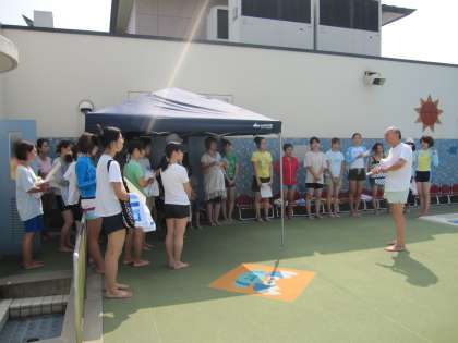 4歳児が組毎に親子で屋上のプールに入りました。学校運営協議会もえぎテインクル委員の日本赤十字社水上安全法・救急法指導員、日本水泳連盟上級水泳指導員の市川博敏先生にきていただき、水遊びの注意事項などを聞いた後、親子でプール遊びを楽しみました。リレーやウレタンの橋渡りなどみんなで遊んで歓声が上がりました。「見てて!」と笑顔いっぱい得意気でした。