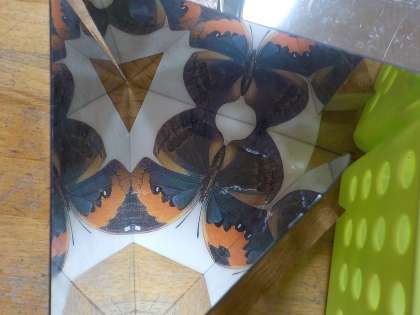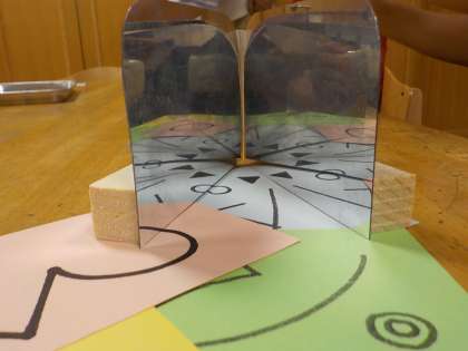 。曲げることができる鏡で自分の顔を見てみたり,目の上に鏡をおいて自分の顔をさかさまにみてみたり,合せ鏡を使っていろいろな形や色の紙をおいたりして,子どもたちはそれぞれ発想豊かにたくさんの発見をして楽しんでいました。