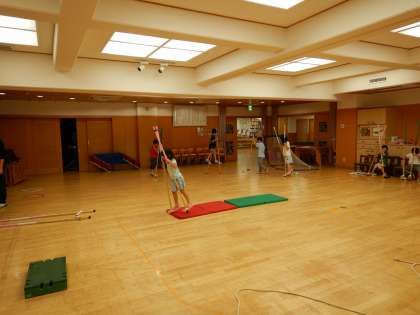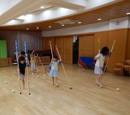 竹馬にのりながら、玉入れの球を蹴って、でゴールを目指したり、柔らかいマットの上を進んだり、巧技台の段差や坂道、縄跳びのくねくね道、後ろ歩きや、横歩きなど、自分なりにやってみたいことを見つけてチャレンジする姿がたくさん見られました。