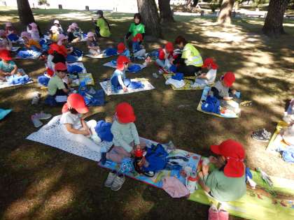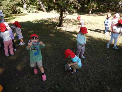 今日は、初めての園外保育に行ってきました。友達と手をつないで、横断歩道や信号も渡って、京都御苑まで歩きました。御苑ではどんぐりや松ぼっくり、キノコなどを見つけて大喜び!「こんなのあったよ!」と友達や先生に知らせて、秋の自然をたっぷり感じてきました。遊んだあとは、「おなかすいたー!」と子どもたち。気持ちの良い木陰で、みんなでおにぎりを食べました。とってもおいしかったね!