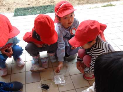 10月の初めに見つけたカタツムリの卵から、ついに赤ちゃんカタツムリが産まれました。待ちに待った誕生に、「ちっちゃーい…」「かわいい…!」「角、ちゃんとあるね…」と神妙な面持ちの子どもたち。そして、親のカタツムリとは別に飼うことを図鑑で知り、「お母さんと一緒じゃなくて大丈夫なの?」とびっくり!赤ちゃんカタツムリのためのおうちをみんなでつくりました。「いっぱい食べてね」「大きくなりますように!」と、優しい気持ちでいっぱいになっていました。