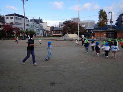 4・5歳児は、今日からマラソンごっこを始めました。走る前は「さむーい!」と話している子どもたちも、マラソンが終わった頃には「あっつい!」「あつあつマラソンや!」と話していました。朝一番に走ったことで、その後の遊びも気持ちよく元気に楽しんでいました。寒くなるとともに、気持ちも体も動きにくくなりがちですが、みんなでマラソンごっこを楽しみ、1日をスタートしていきたいと思います。