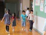 楽しく一緒に遊んだあとは、お兄さん・お姉さんが手をつないで「学校案内」をしてくれました。「ここは音楽室だよ」「ここは理科室」と次々と各教室を案内してもらい、5歳児たちは初めて見る小学校内の様々な光景に胸をワクワクさせていたようです。「階段気をつけてね」「廊下は走ったらあかんよ」と優しく声をかけながら学校のルールも少しずつ教えてもらいました。
