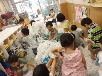 雨でプールに入れないのならと,大量のおとし紙をちぎってお部屋にプールをつくってそれに入って「プール〜」「おふろ〜」「きもち〜」と言いながら遊んだり。
