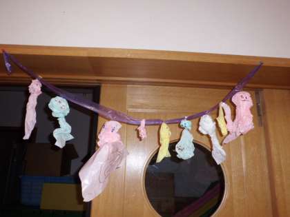 ある男の子が「せんせ〜い!てるてる坊主つくろっかぁ」と言ってくれたのをきっかけに,みんなで幼稚園用とおうち用でてるてる坊主をつくって飾ってみたり。
