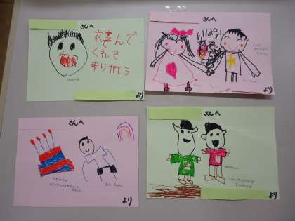 手をつないでくれたこと,一緒に学校探検したこと,だるまさんがころんだをして遊んだこと,など思い思いに楽しかったことを絵や文字にしていました。