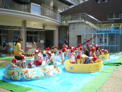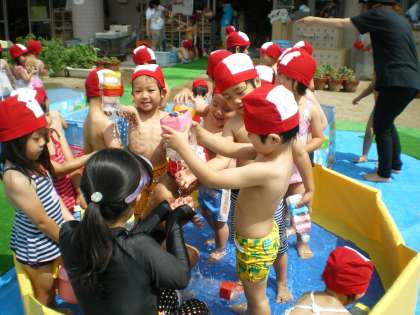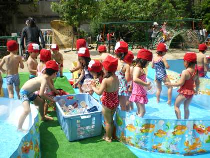でも今日は,ようやくいいお天気になりました。園庭にはビニールプールがいっぱい!!待ちに待ったプール遊びです!!